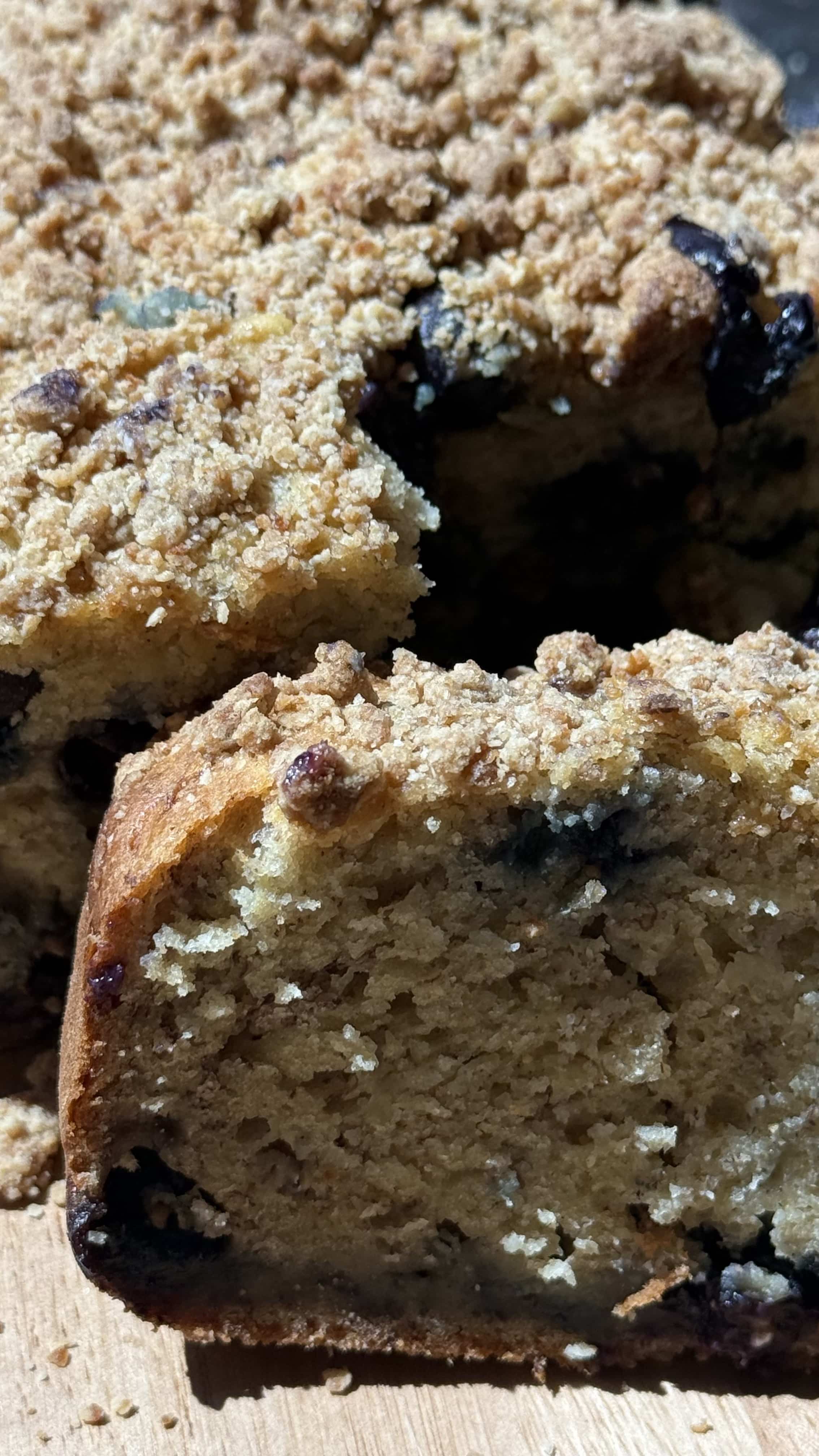 So this is what came out of it: a mashup between banana bread and the best kind of blueberry muffin. It’s soft, sweet (but not overly), and full of juicy berries and that muffin-top style crumble we all secretly pick off first anyway, influenced by the idea of combining blueberry muffin and banana bread.