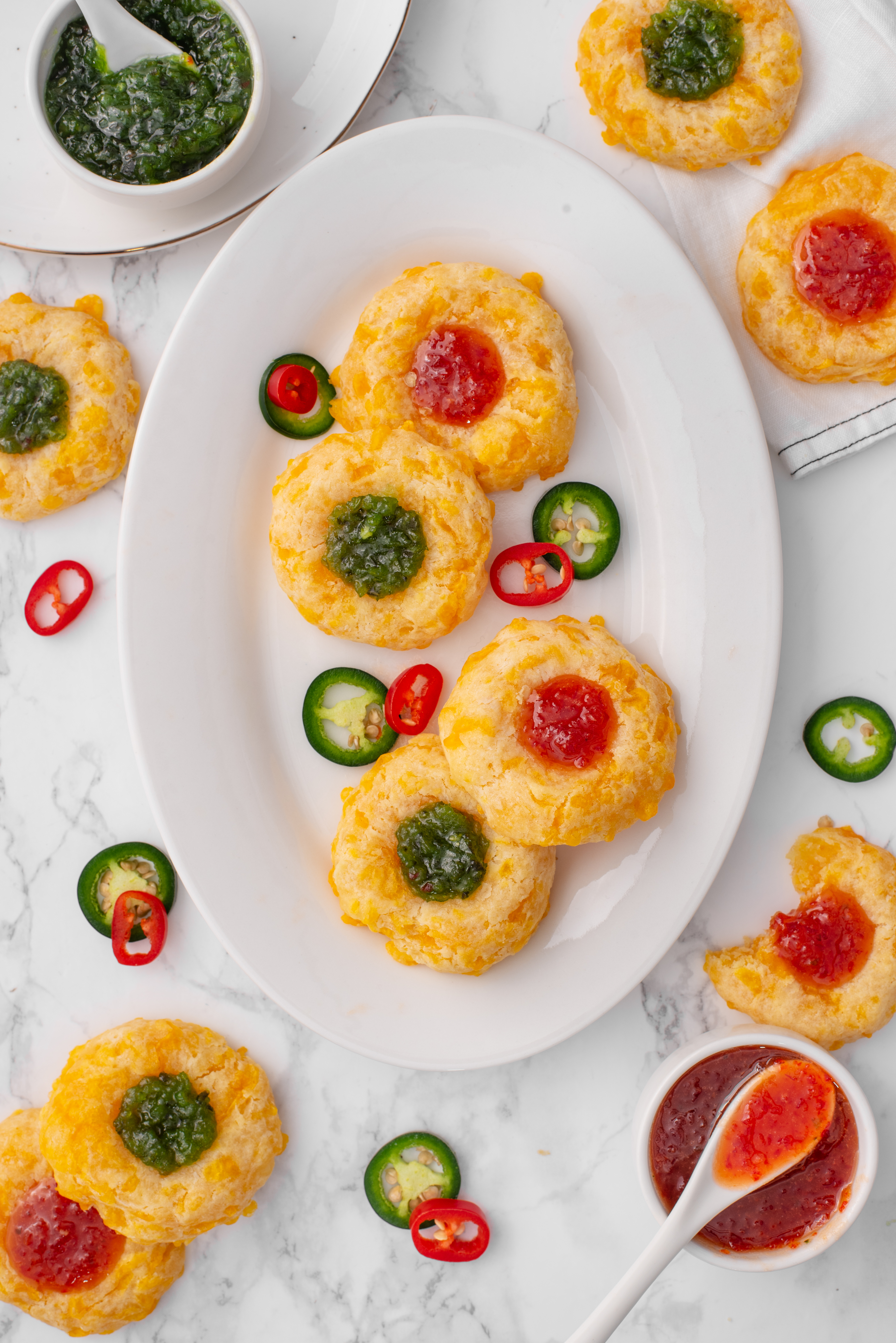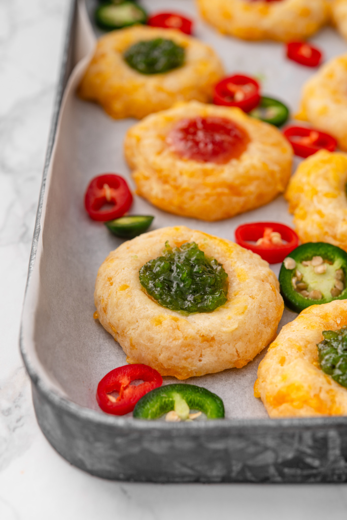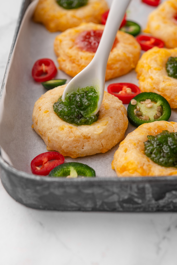 Cheesy Thumbprint Cookies with Red & Green Pepper Jelly