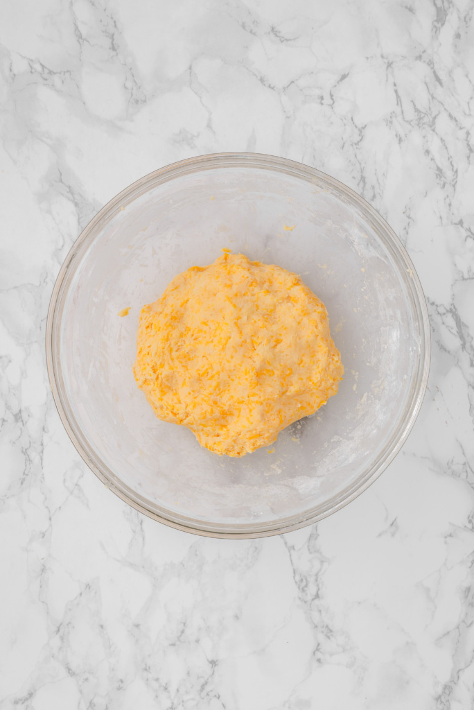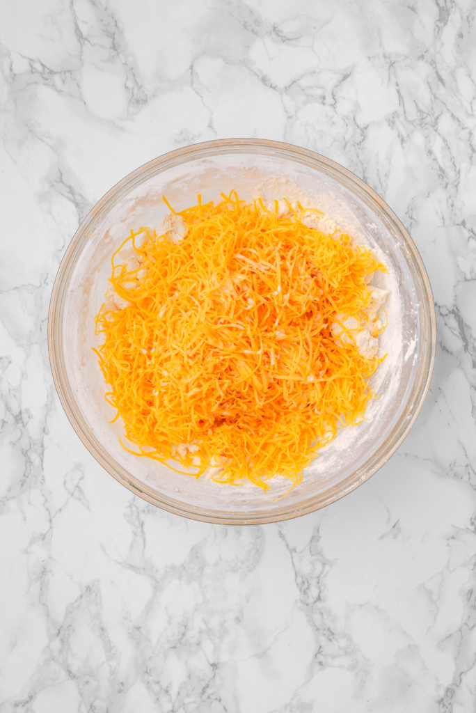 Stir in the arrowroot starch, then gently fold in the flour until just combined. Add the grated sharp cheddar cheese and milk, mixing gently until the dough comes together. Cover and refrigerate for 30 minutes.