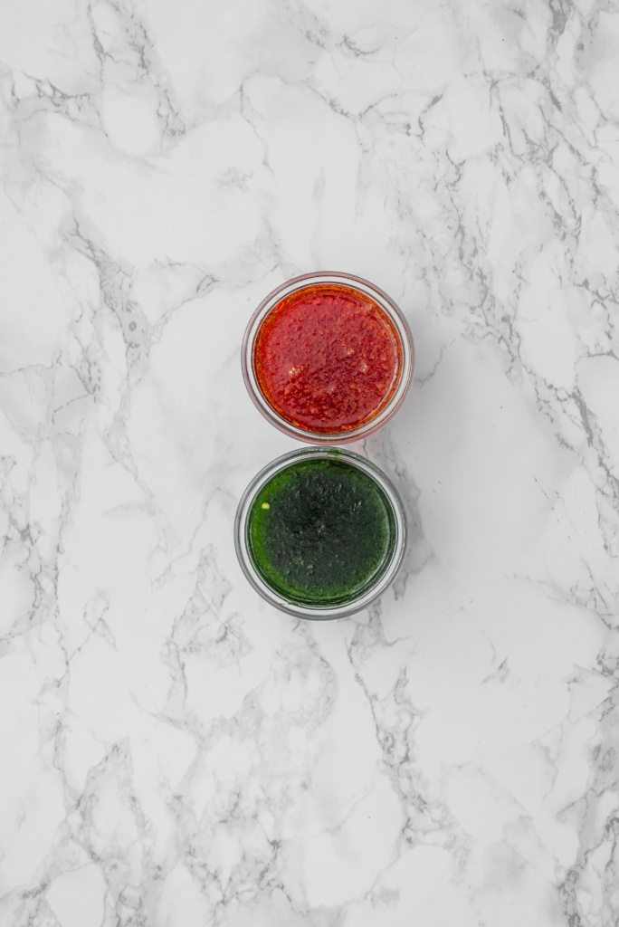 For the red jelly, add the red bell pepper and red chili pepper to a small blender with part of the apple cider vinegar and blend until nearly smooth. Transfer to a small saucepan and stir in half of the coconut sugar and pectin.
