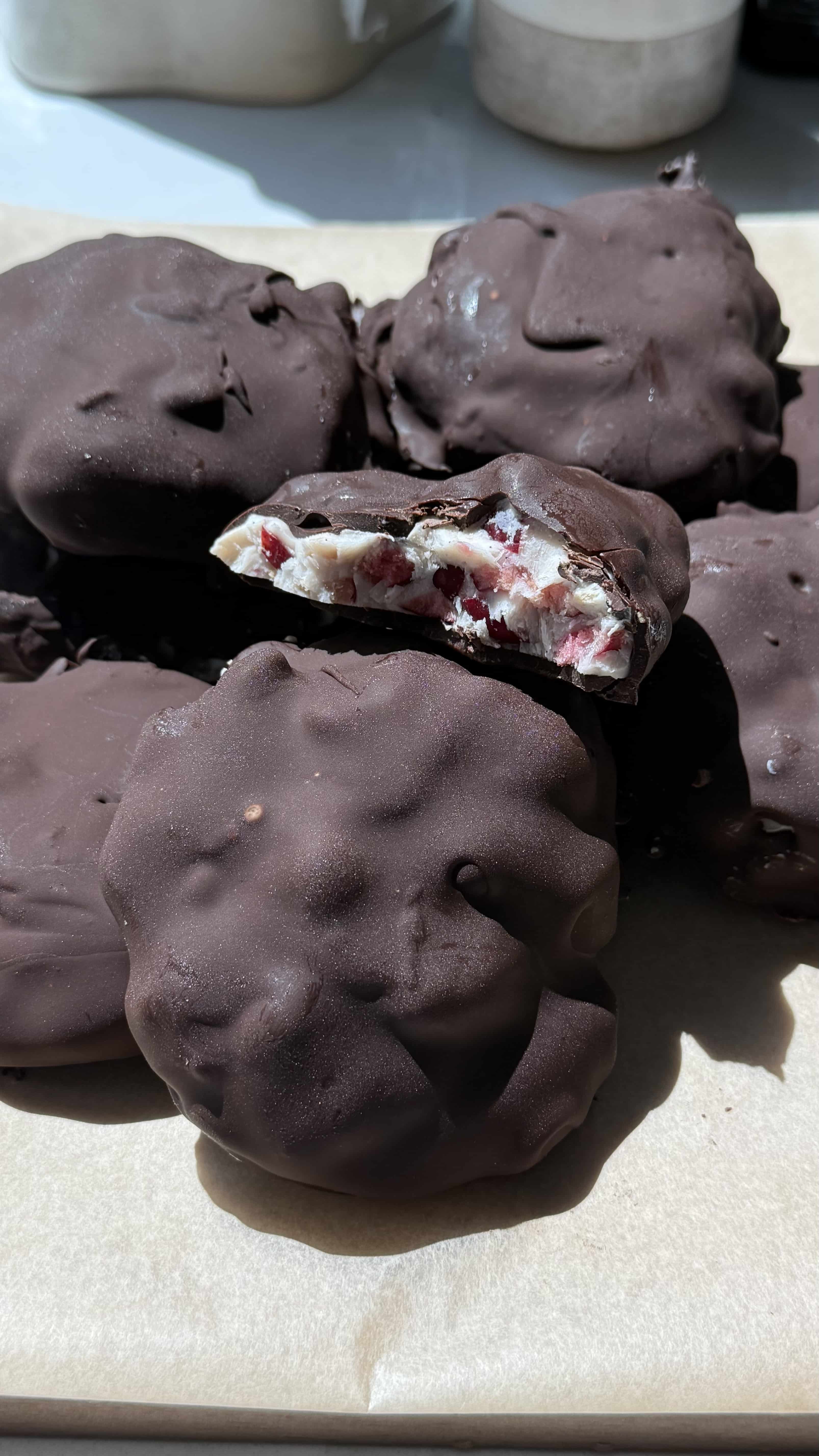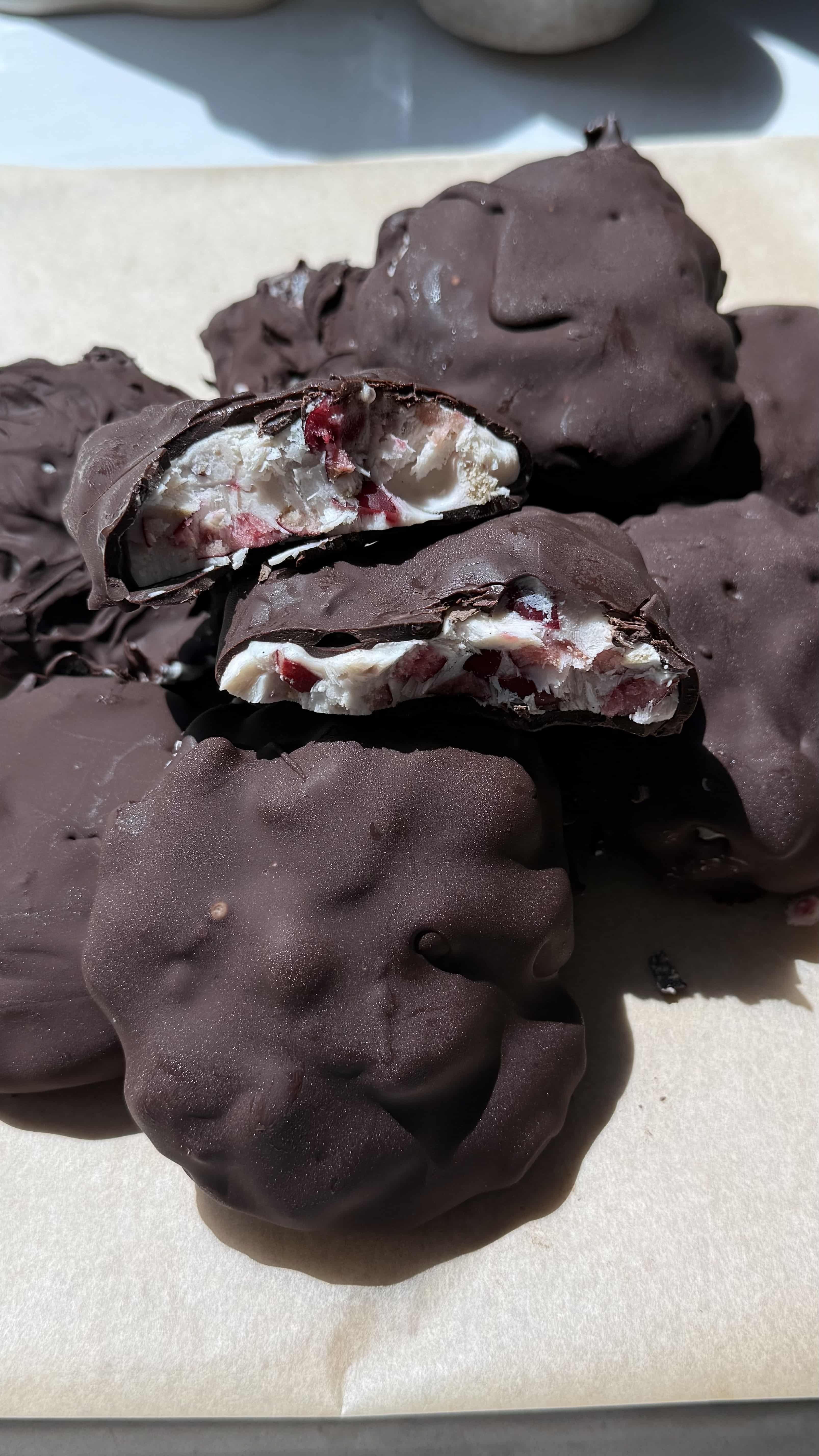 - Melt the dark chocolate chips slowly (using a double boiler or microwave in 30-second intervals). Stir until smooth. Dip each frozen cluster into the melted chocolate, coating completely.