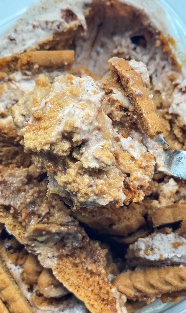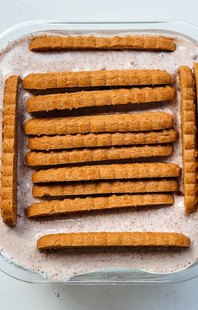 - Line a dish with parchment and layer Biscoff cookies on the bottom.