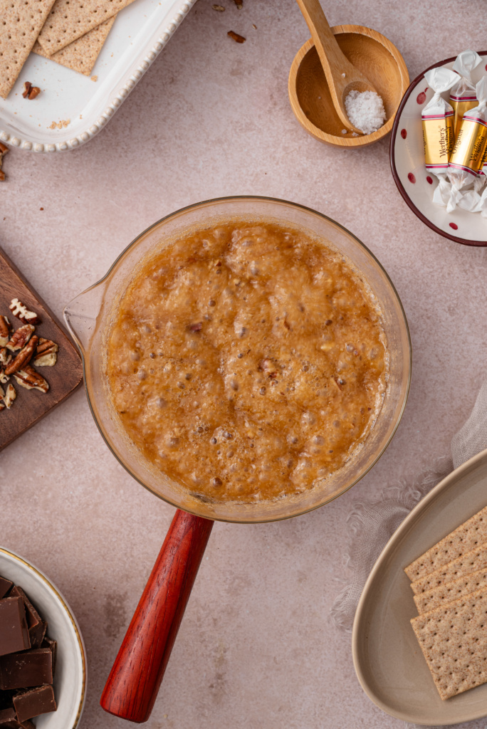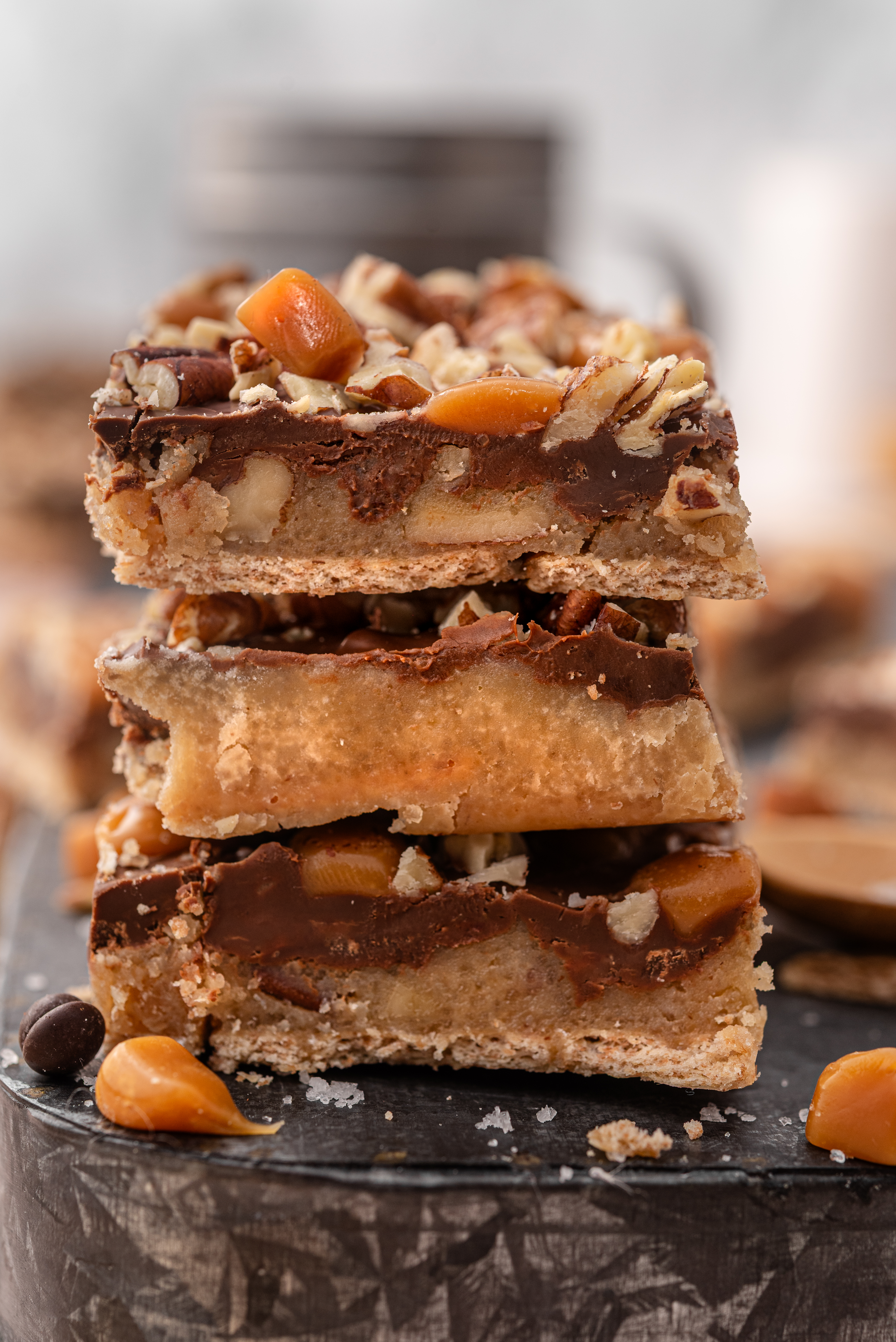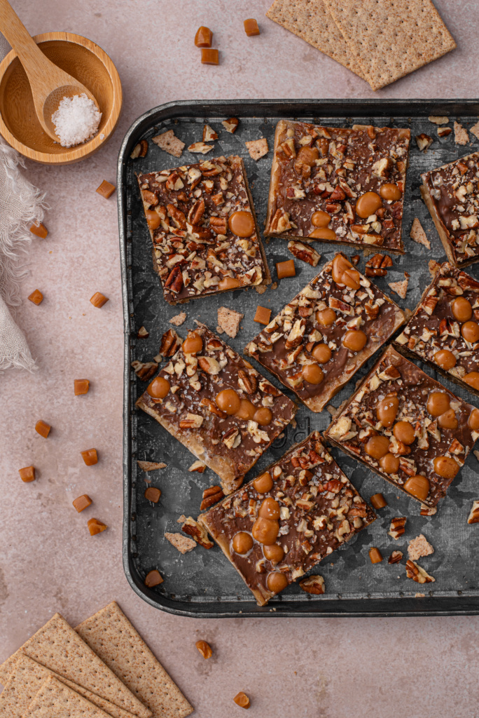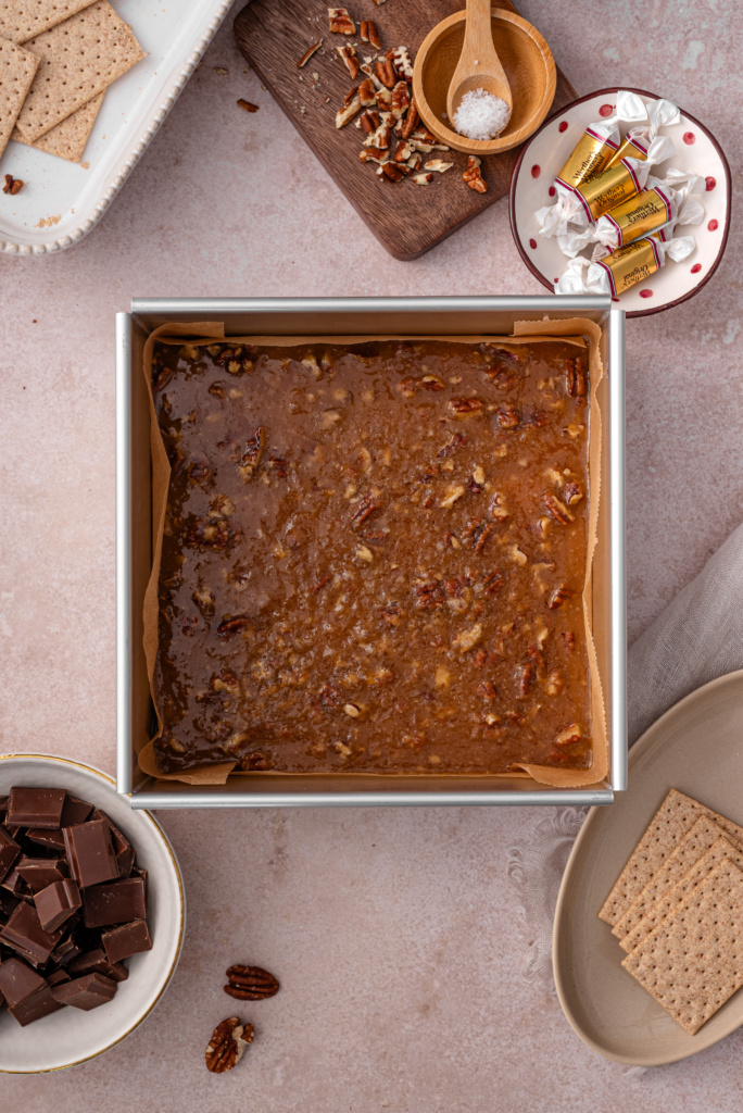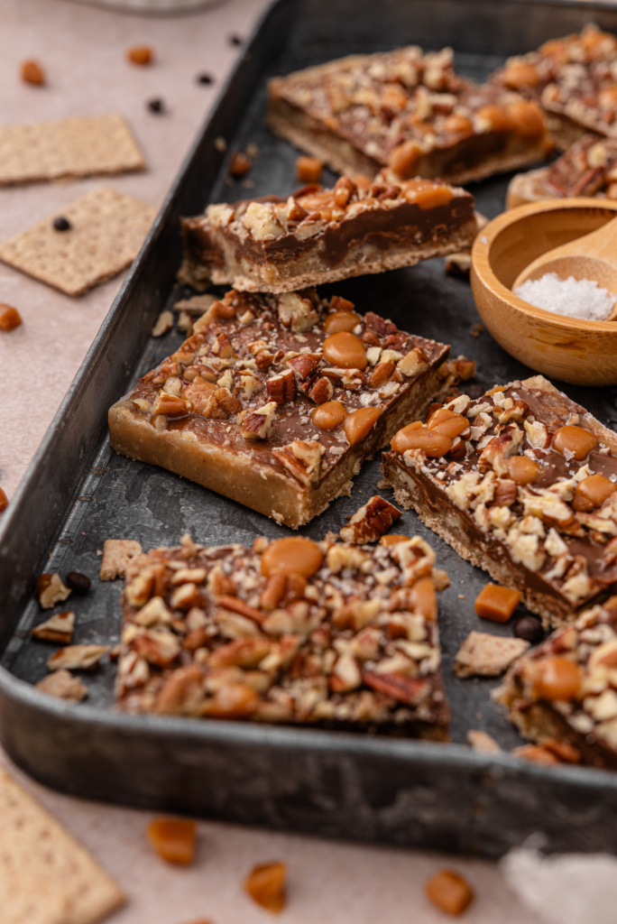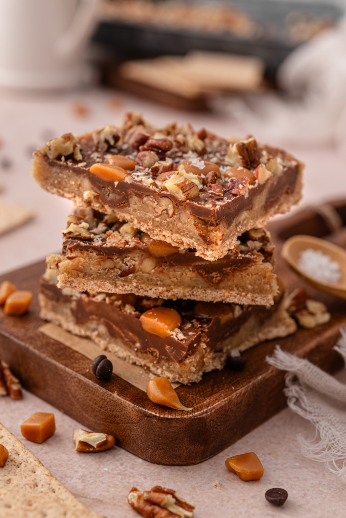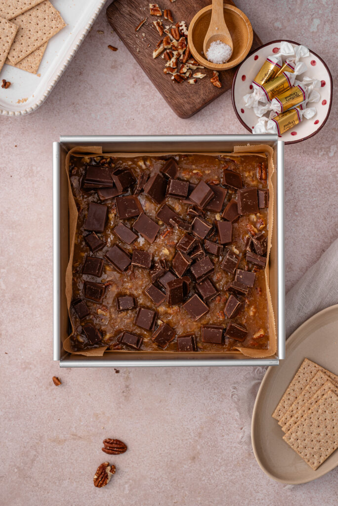 At their core, these bars are all about layers. A base of graham crackers or saltines provides structure and crunch. A quick stovetop toffee made from butter and sugar bubbles and caramelizes as it bakes, binding everything together. Melted chocolate spreads into a smooth layer on top, while chopped pecans and toffee bits add extra crunch. The final sprinkle of flaky sea salt balances the sweetness and brings out the chocolate and toffee flavors even more.