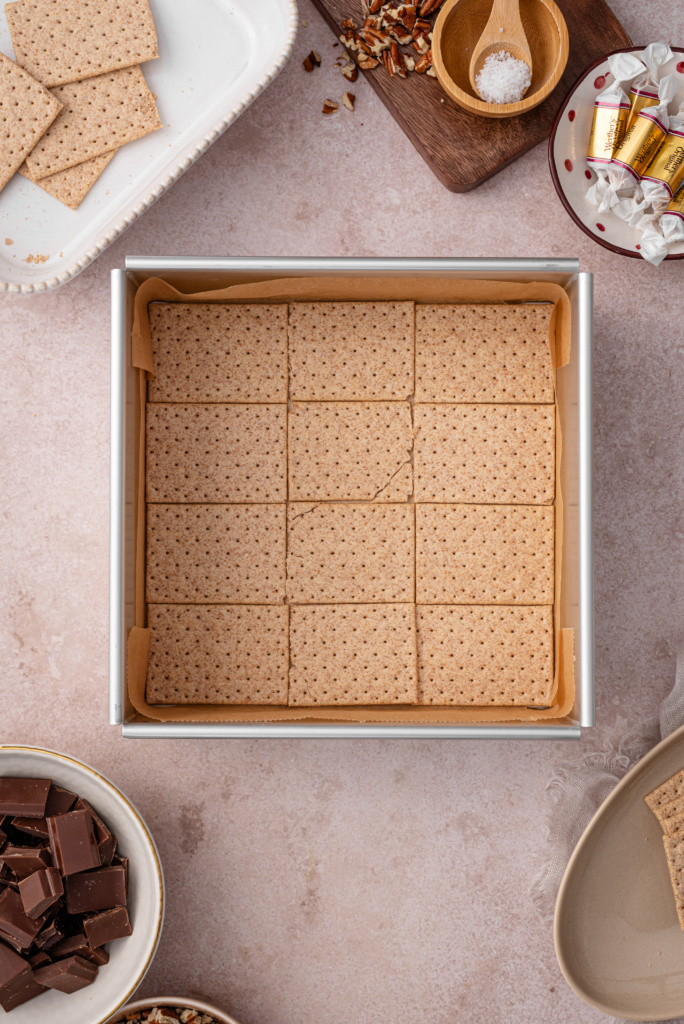 Preheat your oven to 350°F. Line an 8×8-inch baking dish with parchment paper. Arrange graham crackers or saltines in a single layer, breaking pieces as needed to cover the bottom completely.