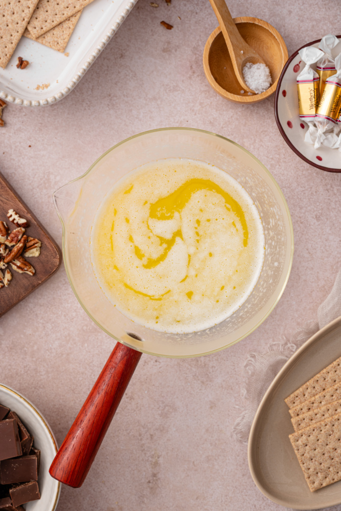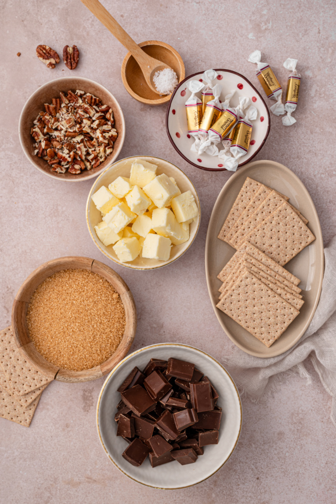 Graham crackers or saltines: These form the base of the bars. Graham crackers add a slightly sweeter flavor, while saltines provide a stronger salt contrast. Either works, just make sure the bottom of the pan is fully covered.