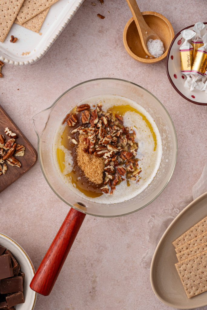 Add the butter to a medium saucepan and melt over medium heat. Stir in the coconut sugar (or brown sugar) and half of the chopped pecans. Bring the mixture to a boil and cook for 4–5 minutes, until bubbly and foamy.