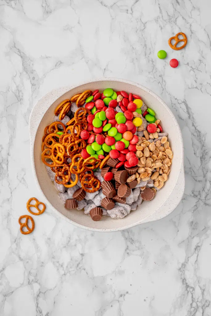 Pretzels: Pretzels add crunch and a salty contrast that keeps this snack from being overly sweet. They also help bulk up the mix so it’s perfect for sharing.