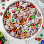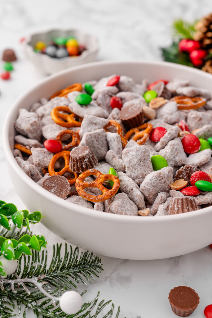 If there’s one holiday snack I make every single year without fail, it’s Christmas Muddy Buddies. They’re quick, nostalgic, and somehow always the first thing to disappear from the counter. This festive spin on classic puppy chow takes everything you love about the original and gives it a holiday upgrade with cinnamon cereal, mini Reese’s, red and green M&Ms, pretzels, and roasted peanuts.
