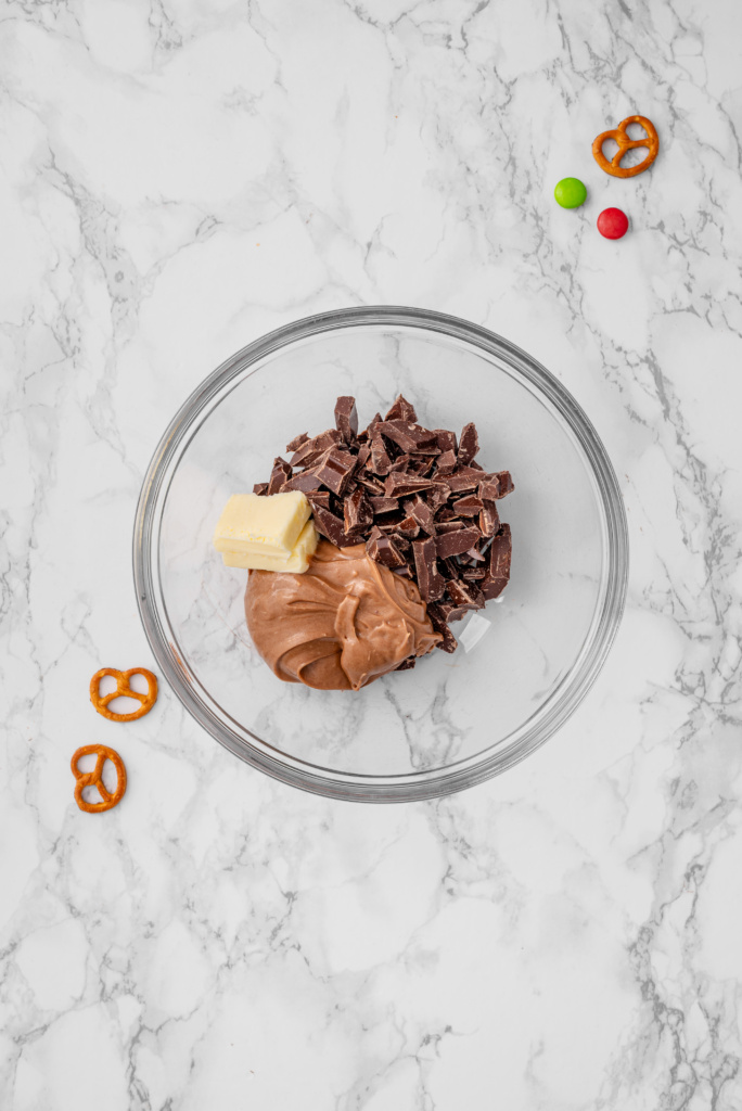 Add the chocolate chips, peanut butter, and unsalted butter to a microwave-safe bowl. Microwave in 30-second intervals, stirring between each, until completely melted and smooth.