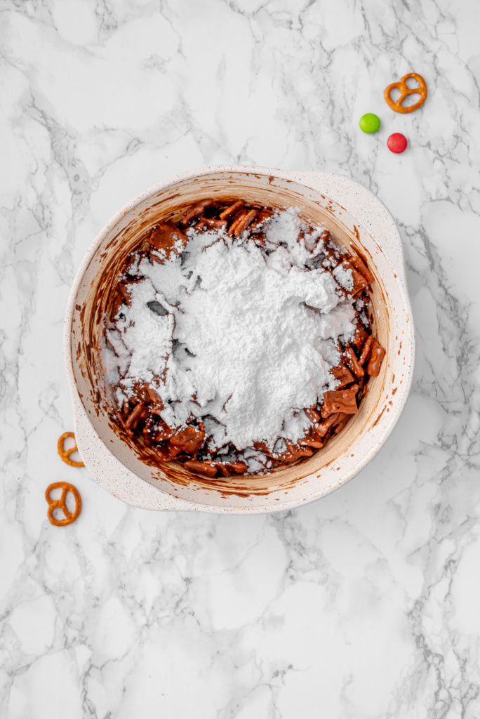 Powdered sugar: This is what gives muddy buddies their signature snowy coating. It balances the richness of the chocolate and keeps the cereal from sticking together.