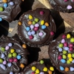 You know those Little Debbie Cosmic Brownies from childhood? This is the grown-up version — high-protein, fudgy, and topped with rainbow candy-coated chocolate just like the real deal. They’re a favorite for meal prep and dessert cravings, and the ganache is honestly a core memory now.