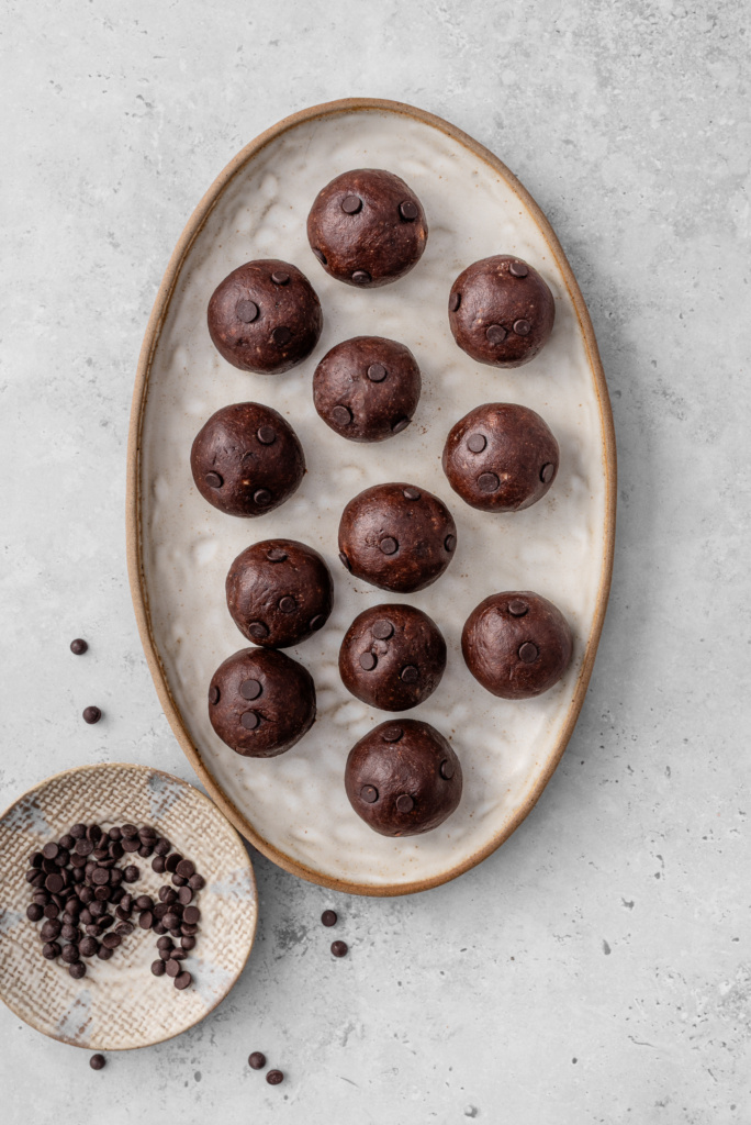 Divide into bites using a tablespoon or miniature cookie scoop. To give it a better appearance, simply roll it between your palms into balls.