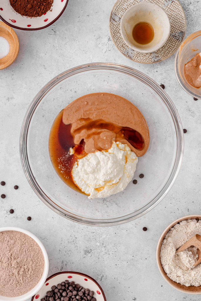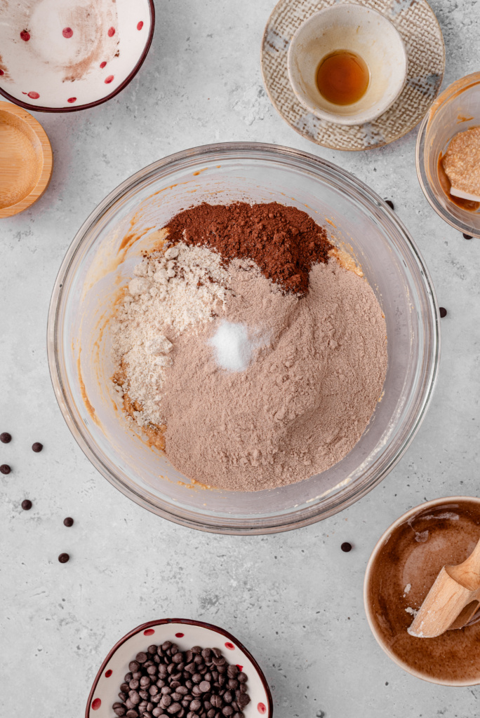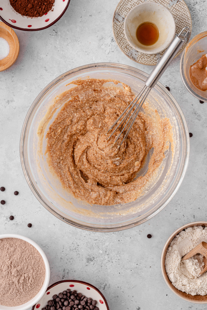 - Mix with almond butter, maple syrup, protein powder, cocoa, flour, and salt.