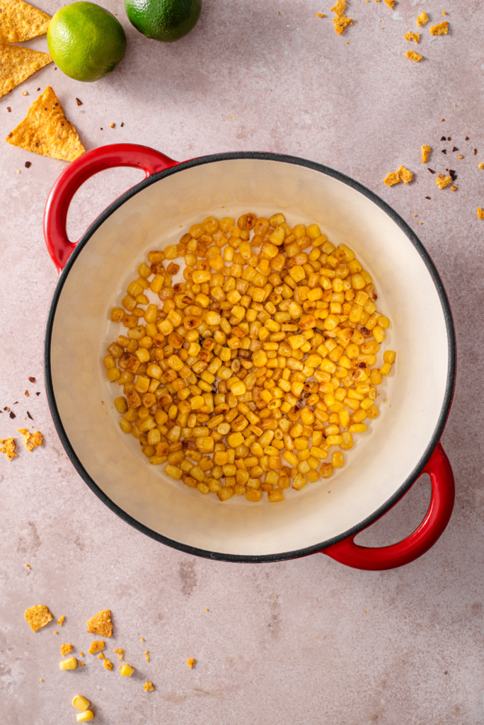 - Heat a large Dutch oven or heavy-bottom pot over medium-high heat. Add ½ tablespoon olive oil and 1½ cups frozen corn. Spread the corn into an even layer and cook without stirring for 2–3 minutes until charred. Stir and cook another 2–3 minutes until lightly browned. Remove corn to a bowl and set aside, leaving browned bits in the pot.