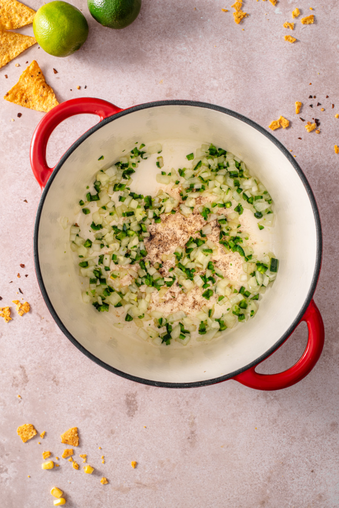 - Reduce heat to medium. Add the remaining ½ tablespoon olive oil, diced onion, and jalapeño. Cook for 4–5 minutes until softened. Stir in garlic and cook for 30 seconds until fragrant.