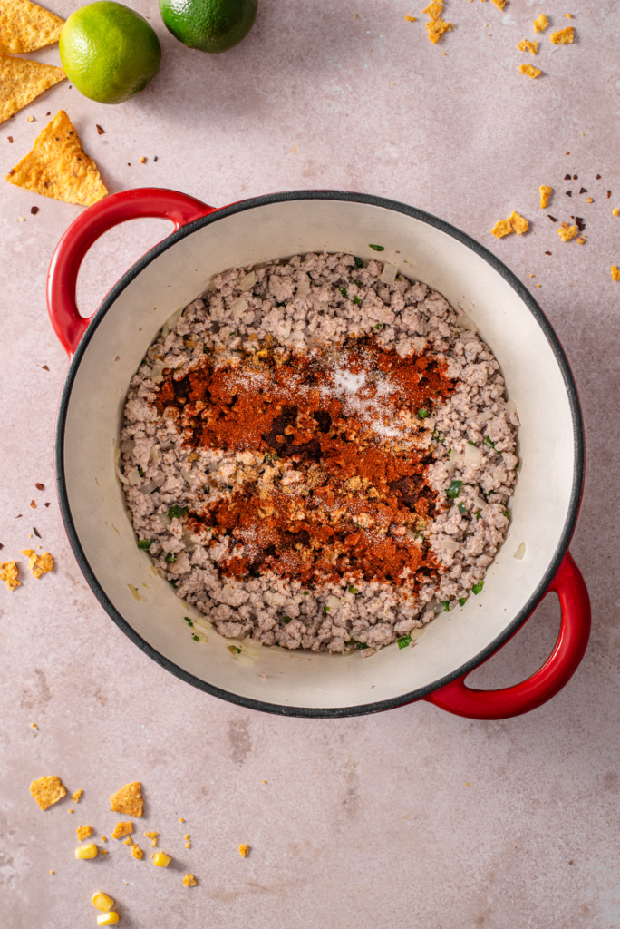 - Stir in chili powder, smoked paprika, cumin, and salt. Cook for 1 minute to toast the spices.