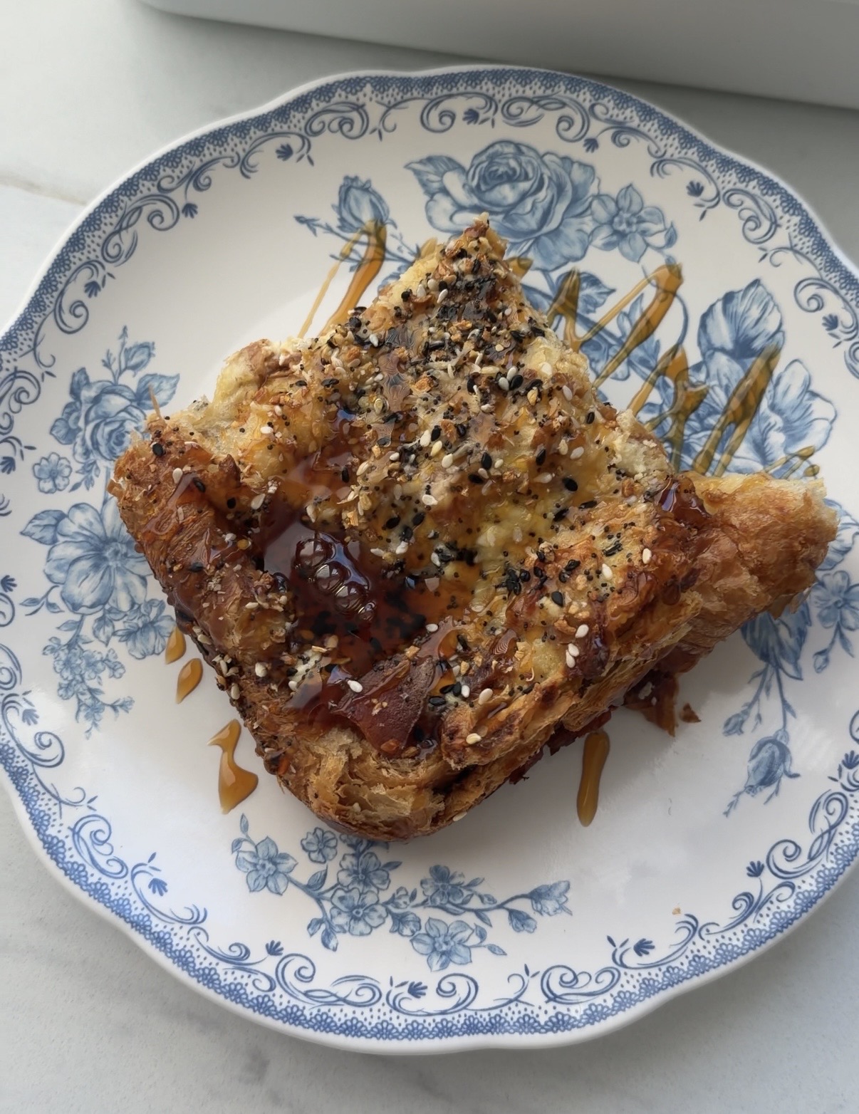 I had a Costco bag of croissants and no plan for them. This is what happened. Torn croissants soaked in a blended egg custard with cream cheese, bacon, everything bagel seasoning, and gruyere melted on top. It tastes like a really good brunch spot made it. You made it in one dish with five minutes of effort.