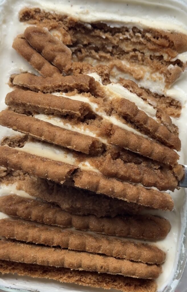 Biscoff cookies act as the base, softening as they chill and giving that lightly spiced, cookie-butter flavor everyone loves.