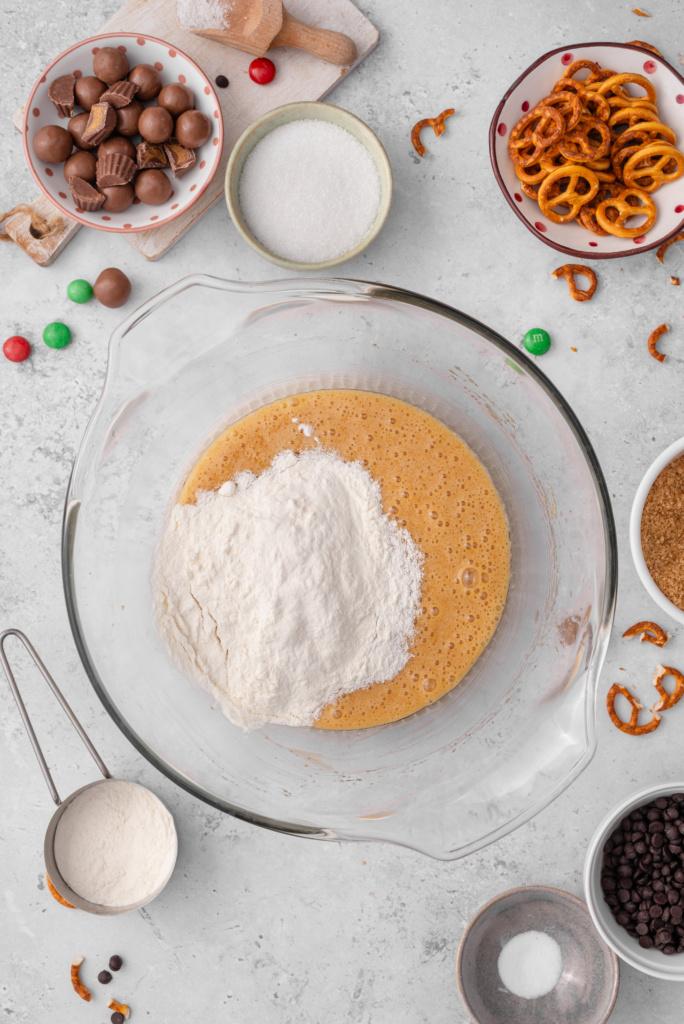 Fold in the flour and baking powder until no dry spots remain. Stir in the M&Ms, crushed pretzels, crushed potato chips, and mini chocolate chips, reserving some chocolate chips for topping.