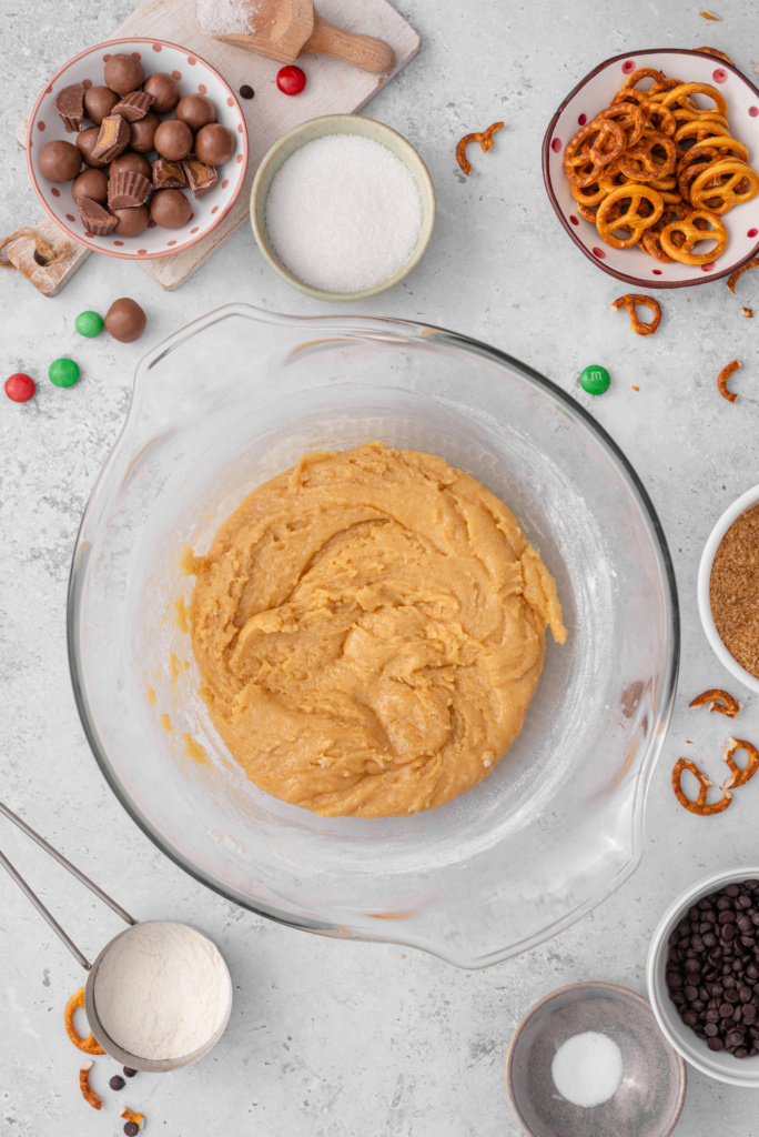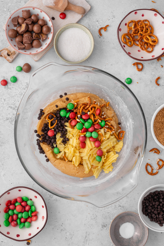- Stir in the M&Ms, crushed pretzels, crushed potato chips, and mini chocolate chips, reserving some chocolate chips for topping.