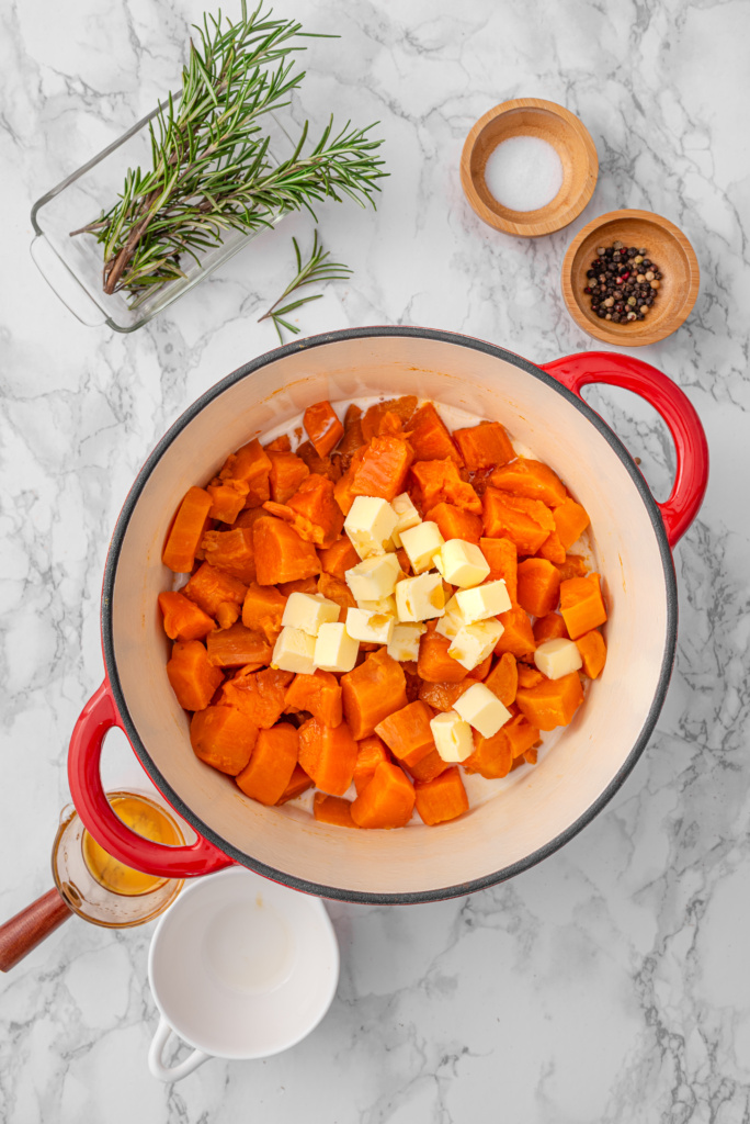 Peel the sweet potatoes and cut into 1-inch cubes. Add them to a large pot.