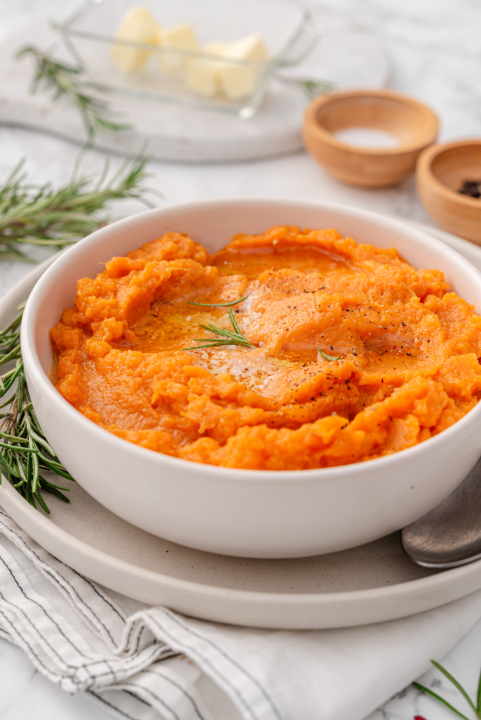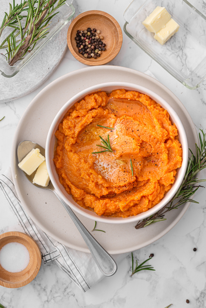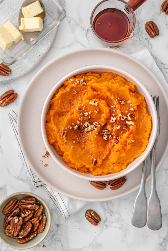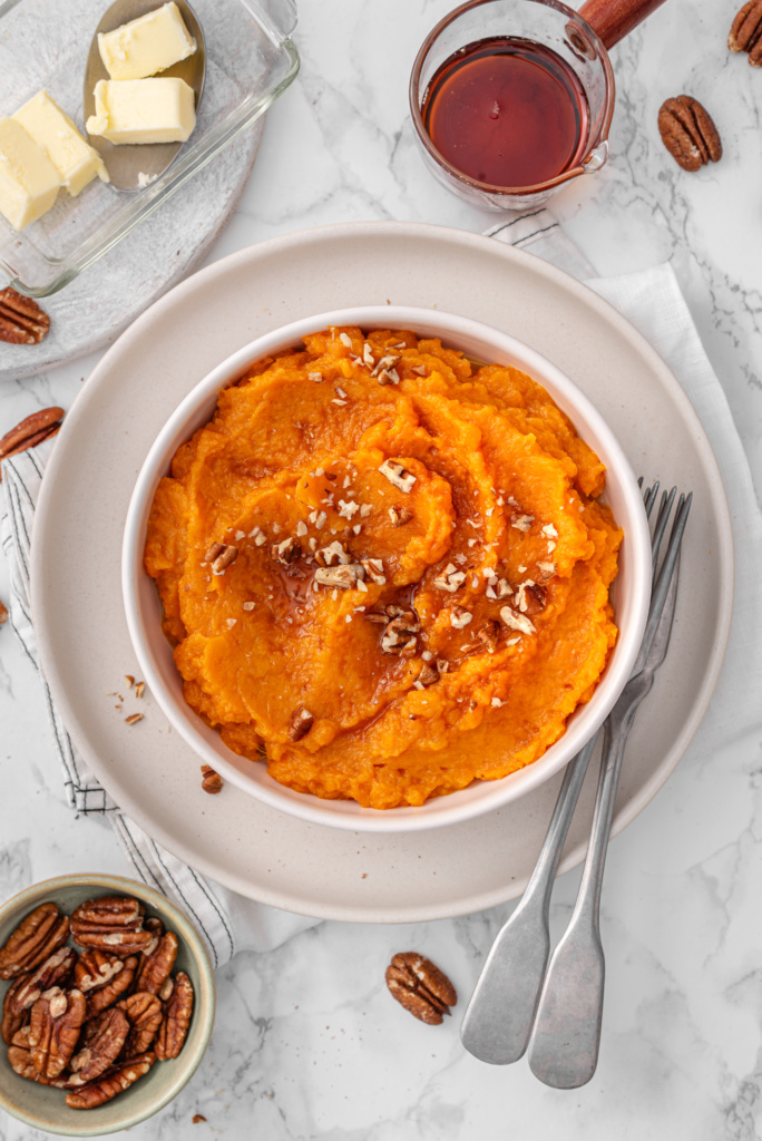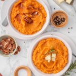 They’re especially popular during the holidays, which is why people often search for Thanksgiving mashed sweet potatoes, maple mashed sweet potatoes, or savory mashed sweet potatoes with herbs. But because they’re quick to prepare, they’re perfect with pumpkin mac & cheese as a comforting side.