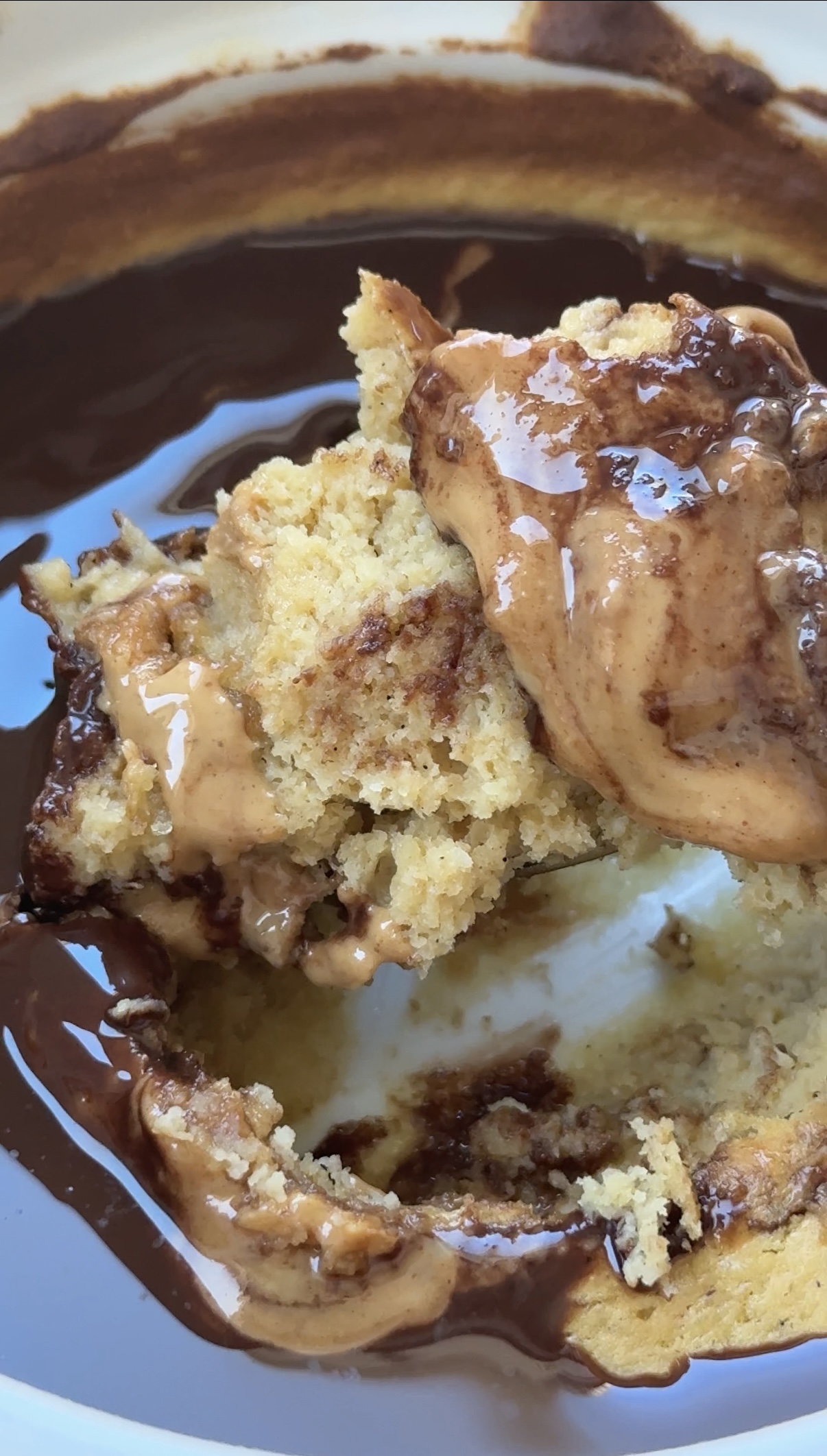 Half of the batter goes into the mug first, then a spoonful of peanut butter gets dropped right into the center. The remaining batter covers it, allowing the cake to cook around the peanut butter while the center stays warm and molten.