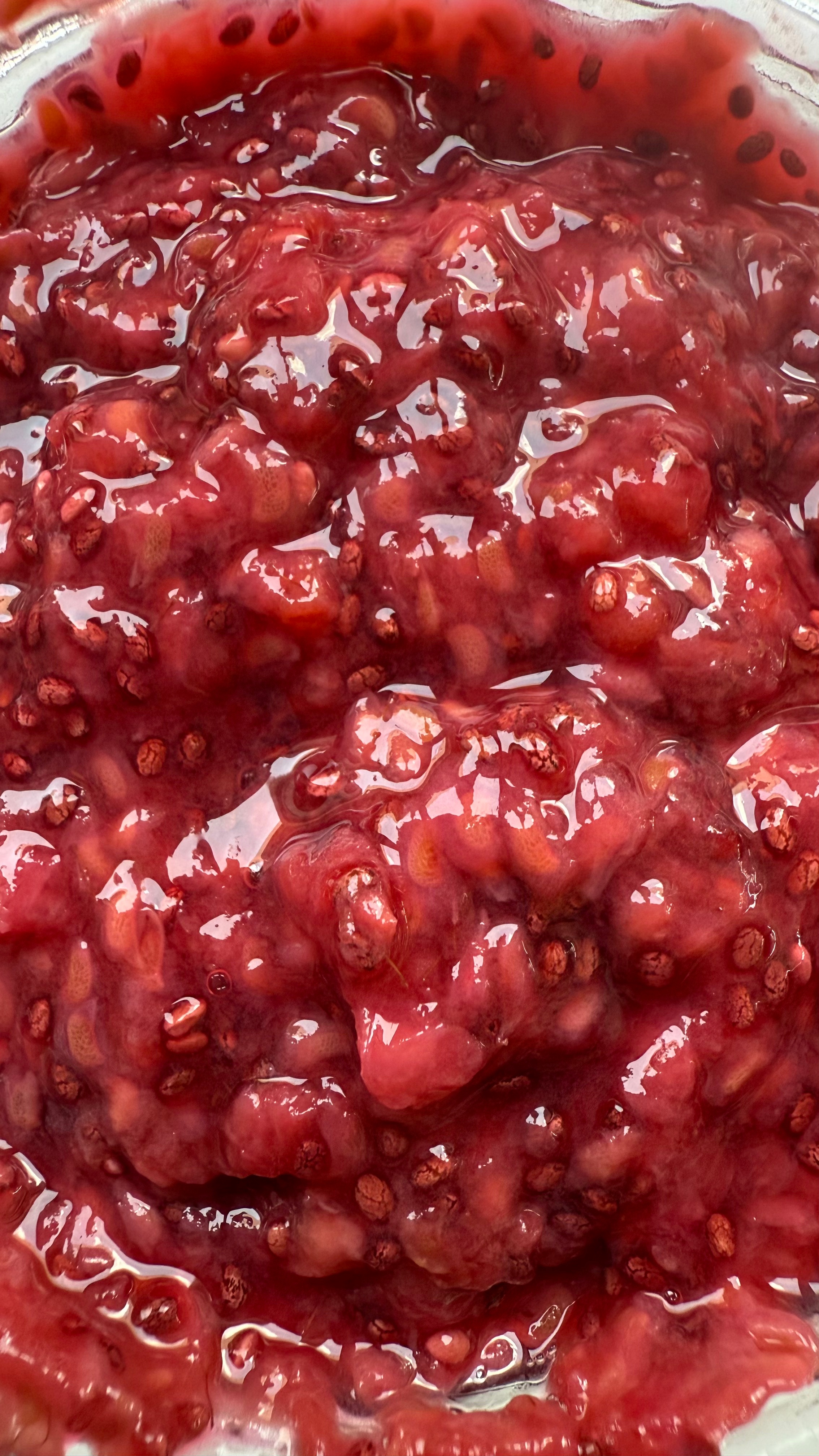 The jam will seem a bit loose when hot, but thickens up significantly after cooling, especially with chia seeds.