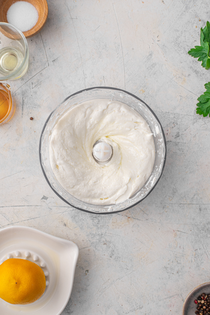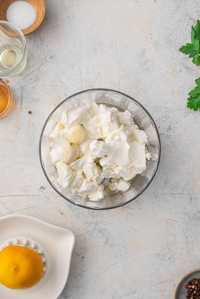 - Blend feta, yogurt, olive oil, garlic, and lemon until smooth.