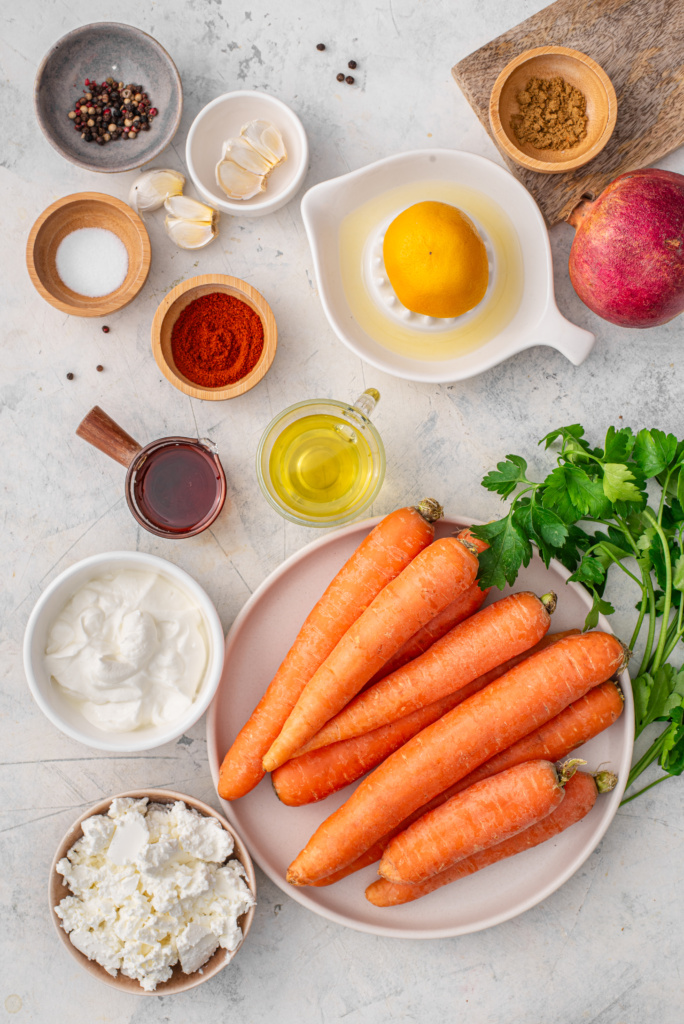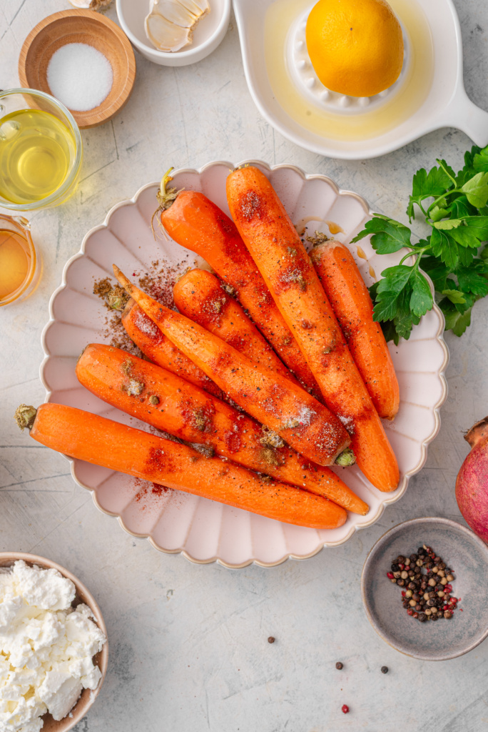 - Spread feta on plate, top with carrots, garnish, and serve.
