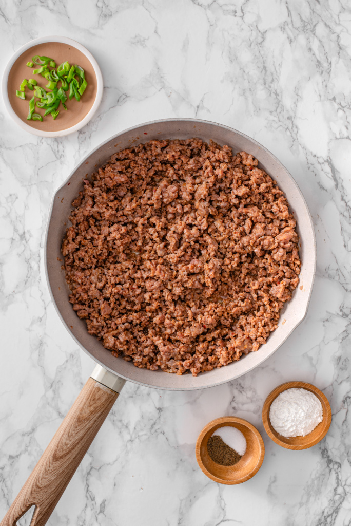 - Brown the sausage until fully cooked. Drain and let cool slightly.