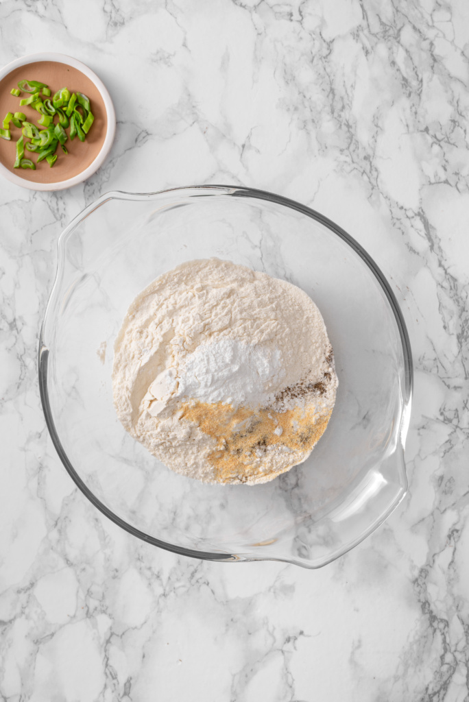 - In a large bowl, whisk flour, baking powder, salt, garlic powder, and black pepper.