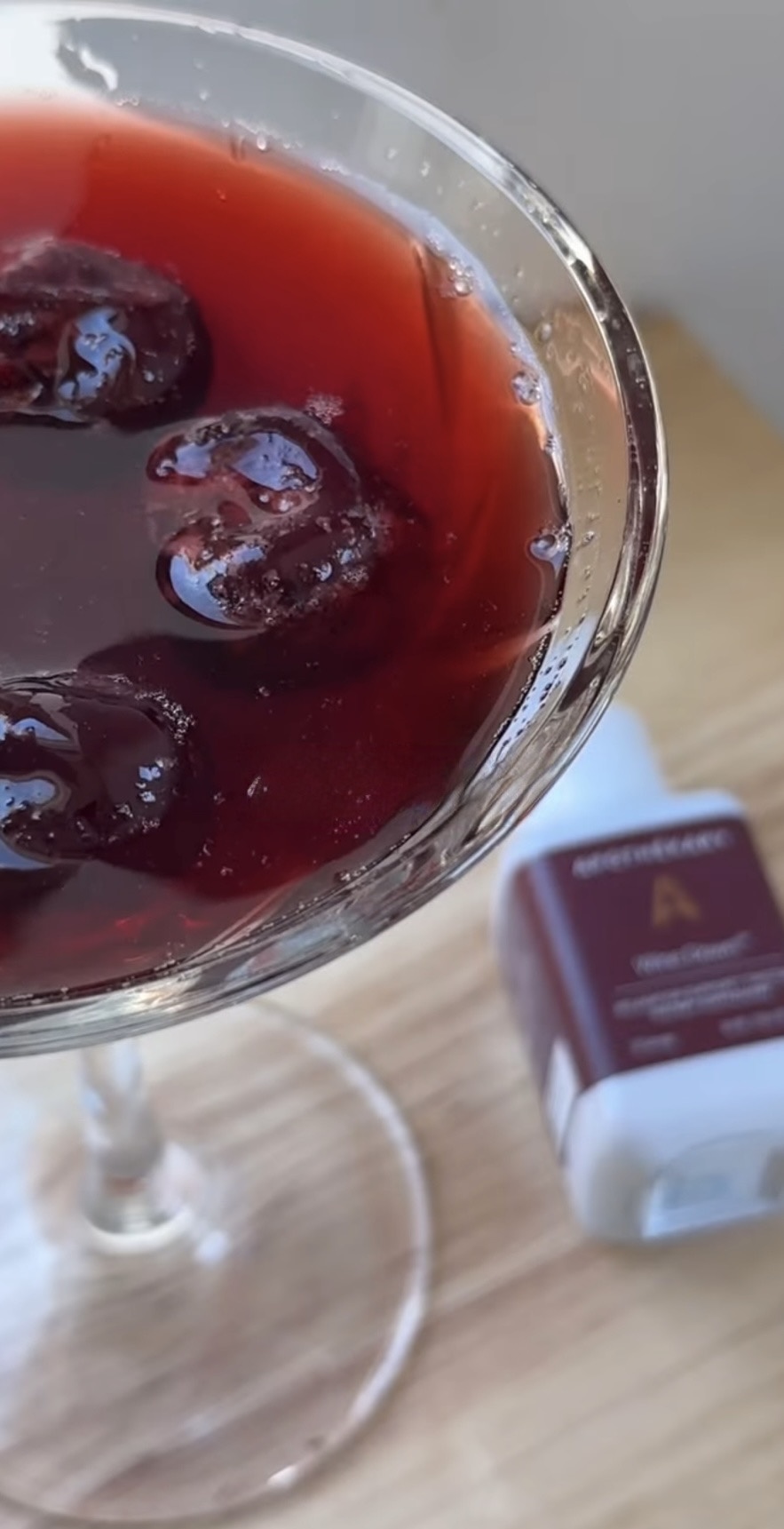 - Once poured into the glass, add @apothekaryco Wine Down, magnesium glycinate, and frozen cherries
