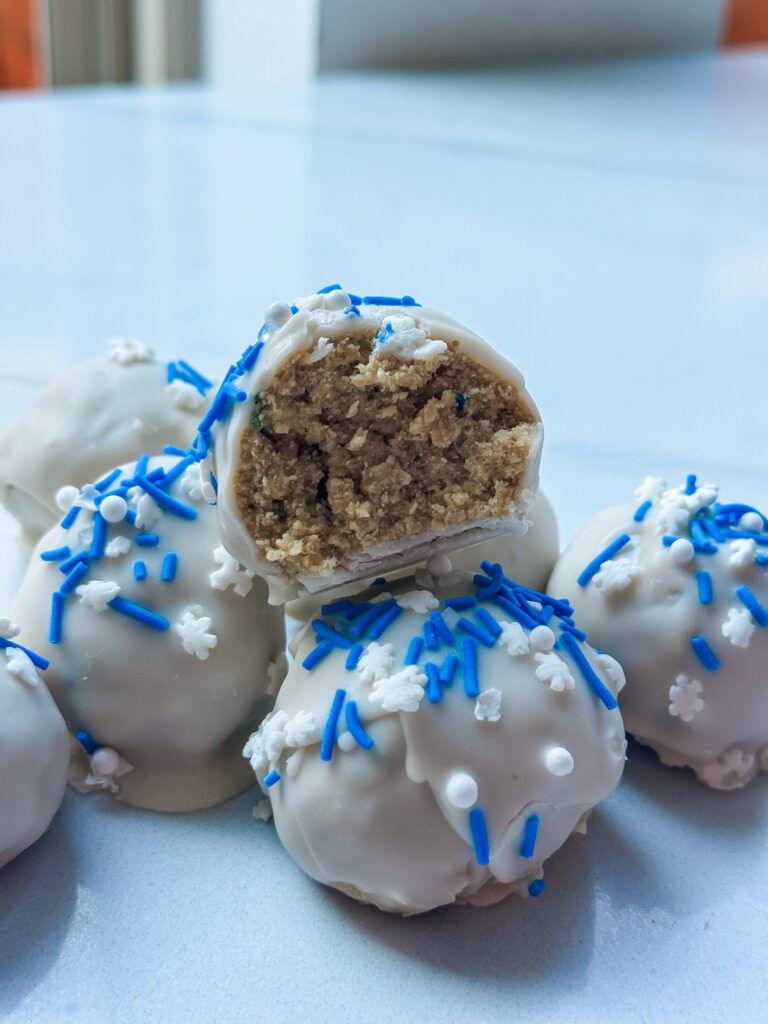 They taste like soft sugar cookie dough wrapped in a thin, creamy white chocolate shell. They’re sweet, cozy, and just the right amount of festive without becoming a production. If your schedule is packed with school parties, holiday errands, or cookie exchanges you didn’t remember you signed up for, these are the kind of treats you can actually pull off.