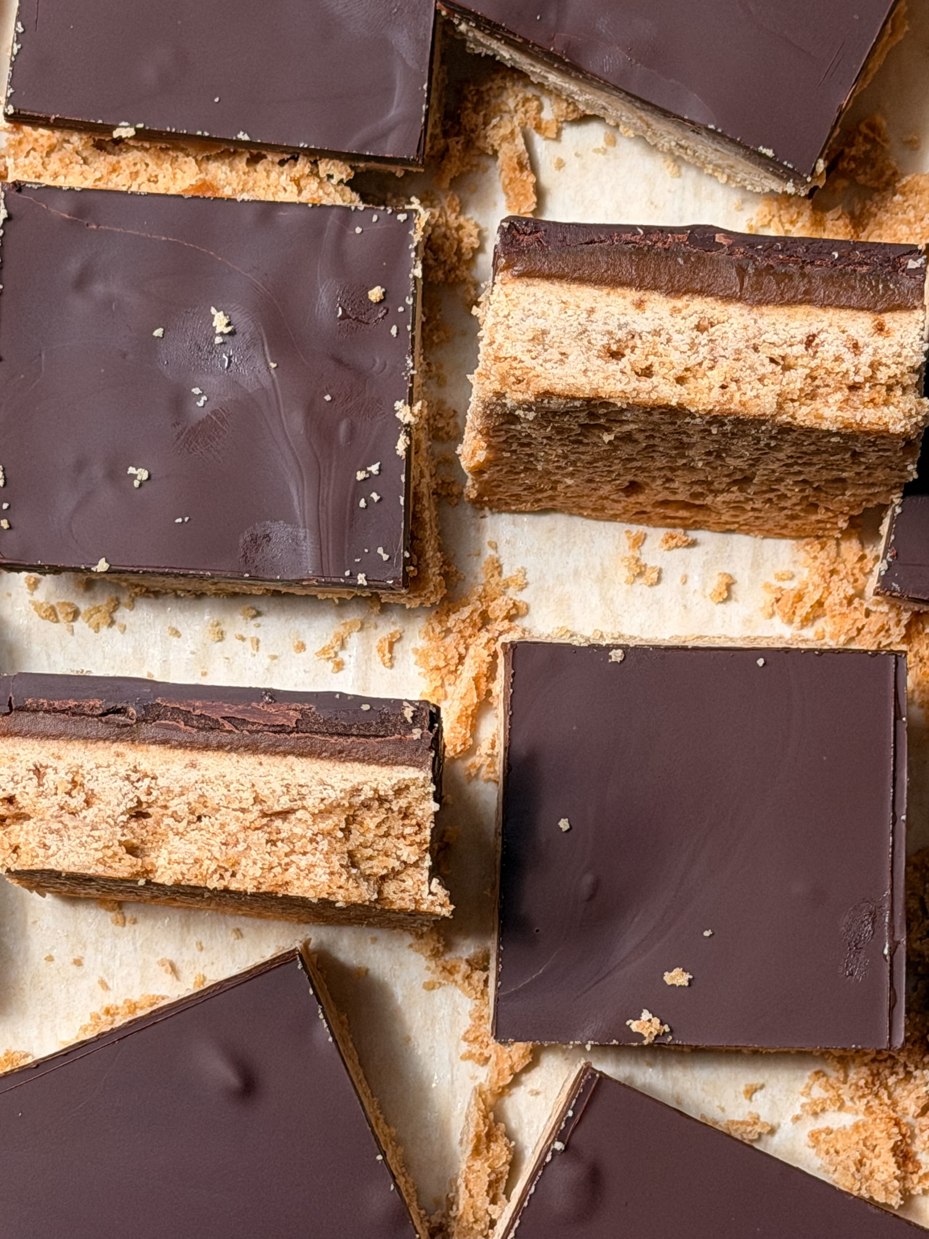 The shortbread base is exactly what you’d expect, butter, sugar, flour. Nothing fancy. It bakes up crisp and holds the caramel without going soggy. The chocolate on top gets a little coconut oil stirred in so it snaps when you bite but doesn’t shatter off the top when you cut the bars.